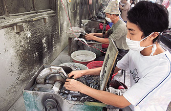 工人打磨完成,再浸在化学药剂里