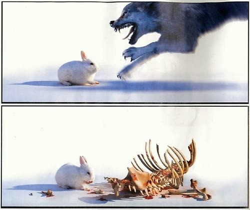 最后,在山洞里,一只狮子在一堆白骨之间,满意的剔着牙读着兔子交给它的文章,题目:“《一只动物,能力大小关键要看你的老板是谁》。”